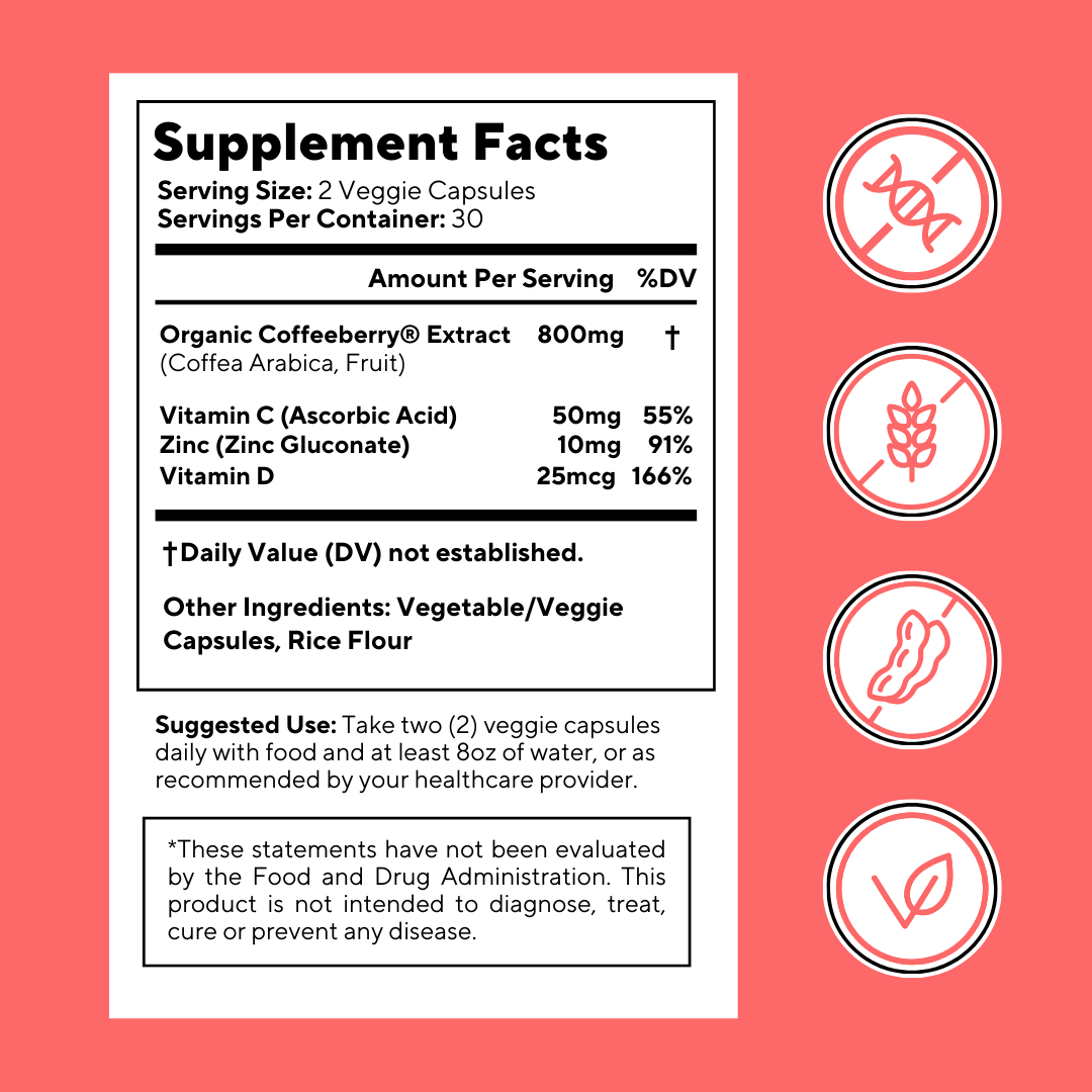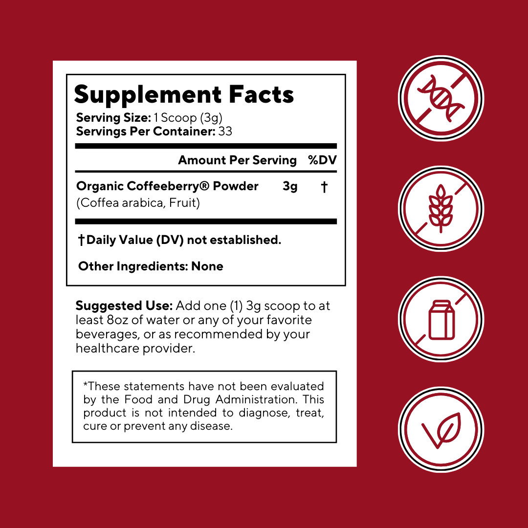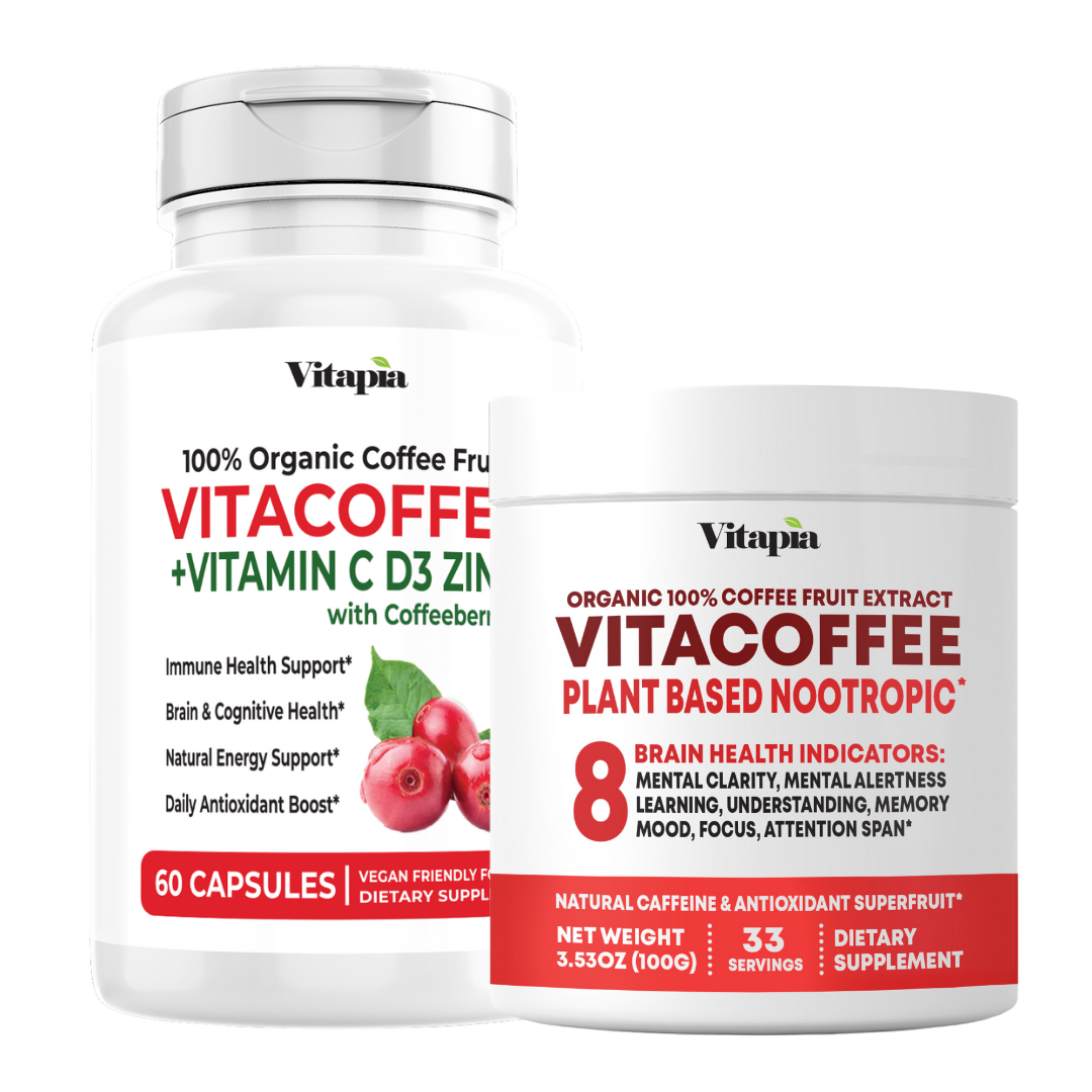 Take 2 veggie capsules of Vitacoffee Coffee Fruit Capsules & 1 scoop of Vitacoffee Coffee Fruit Powder daily with meal and at least 8oz of water, or as recommended by a licensed healthcare practitioner.