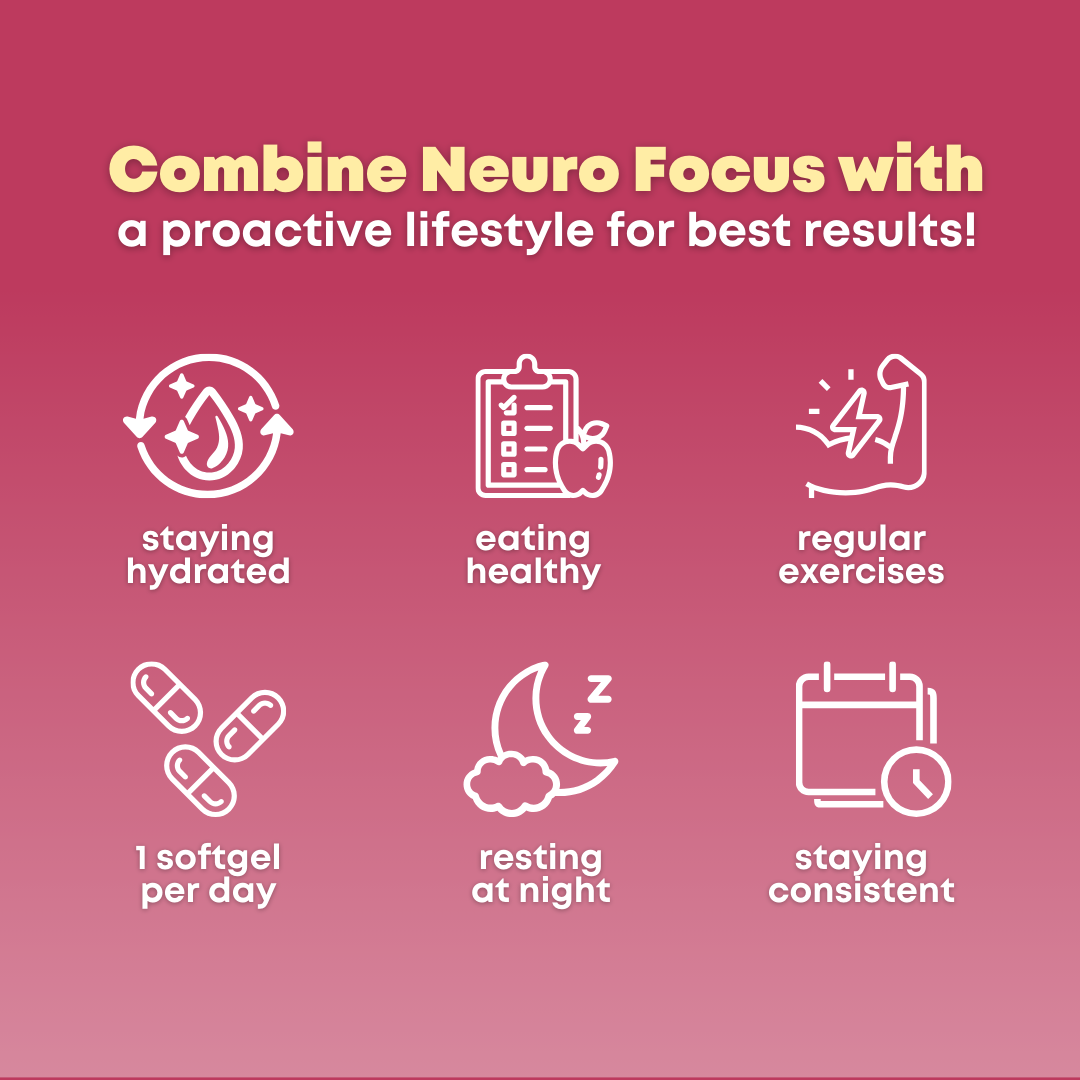 You can make the most out of your Neuro Focus intakes by combining our supplement with a relatively healthy diet, daily hydration, and consistent exercises.
