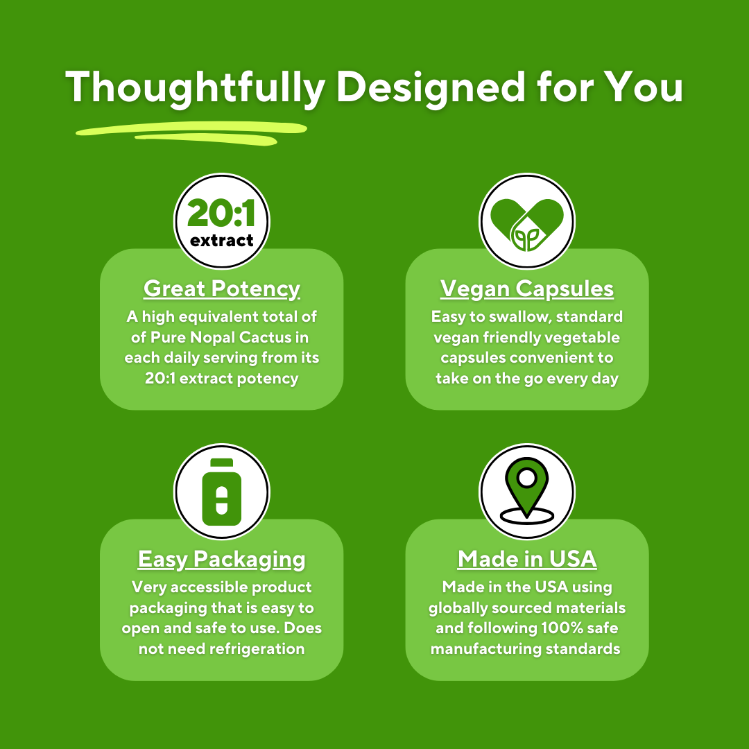 Nopal Cactus is manufactured at a FDA-registered and cGMP compliant facility to ensure product consistency and safety.